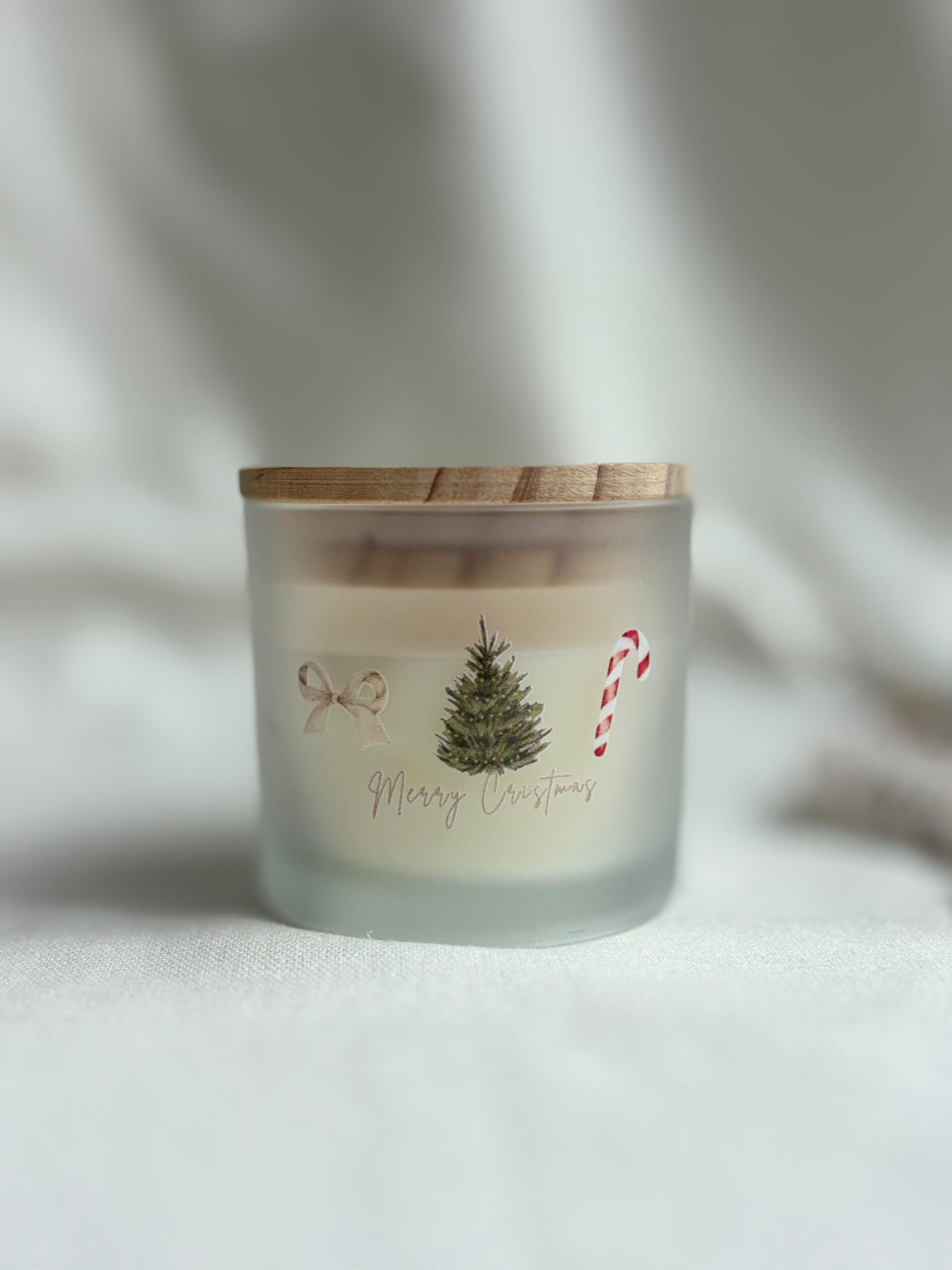 Envase opalado con tapa de madera y etiqueta navideña estilo cozy watercolor, perfecto para complementar tu decoración y llenar tus espacios de calidez en esta Navidad.