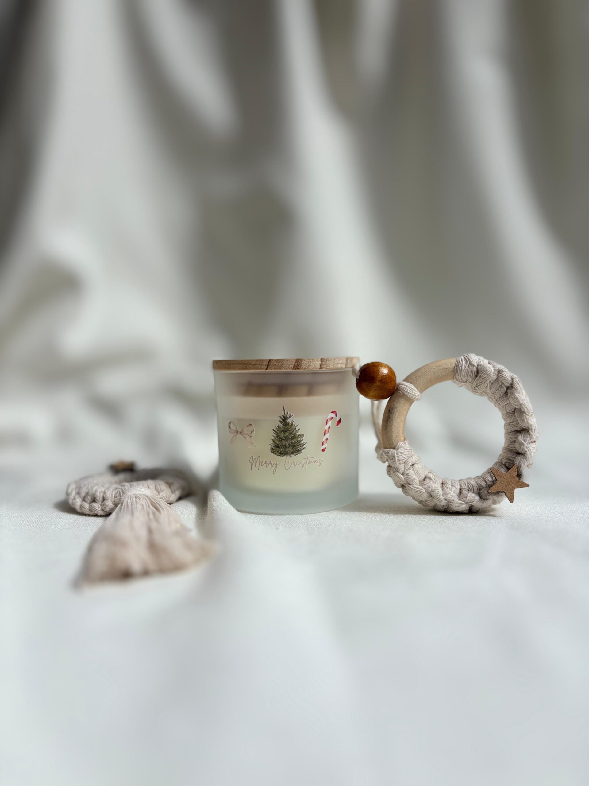 Puedes acompañar tu vela con un adorno navideño en macramé, elaborado a mano y disponible en diferentes estilos: corona, árbol de Navidad, Papá Noel y estrella. Un detalle perfecto para realzar la decoración de tus espacios y darle un toque artesanal y festivo a esta temporada. Valor adicional de $20.000
